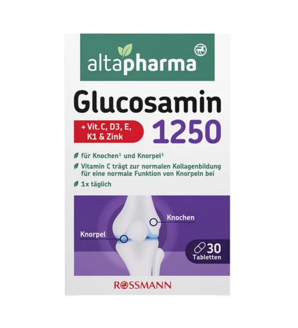 A dietary supplement containing glucosamine, vitamins C, D3, E, K2, and zinc, intended to support cartilage and bone function.